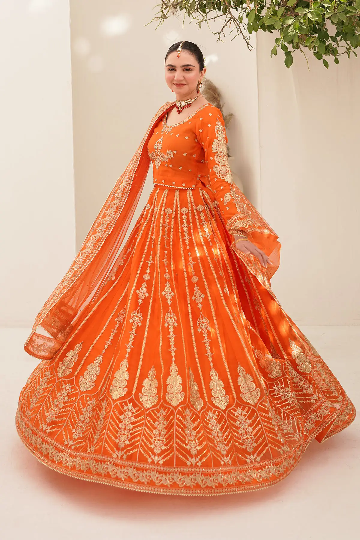 Make a striking impression with the Gorgeous Orange Zari Embroidered Organza Lehenga Set from Siddiqui’s Elite Collection. Crafted from lightweight organza, this lehenga set is adorned with intricate zari embroidery, offering a perfect blend of vibrance, tradition, and elegance. The bright orange hue adds a festive charm, while the detailed handwork enhances its regal appeal – making it an ideal outfit for weddings, engagements, and celebratory occasions.